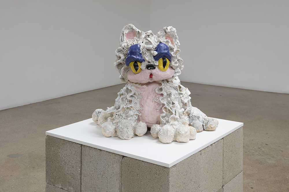 It feels unusual to see the methods and styles seen within craft hobby culture performed within the setting of a mainstream gallery exhibition. With 'Cutie Cat' in particular, elements of cute as a consumerist product begin to warp within this new, ceramic, sculptural form. The shininess of the glaze which mirrors the oh so prevalent plastic or the soft and cuddly textures that are reshaped into flowy, ribbons of fur; 'Cutie Cat' brings cute to the space of fine art in a way that flips how we think about the style and disguises it as something we are more familiar with.